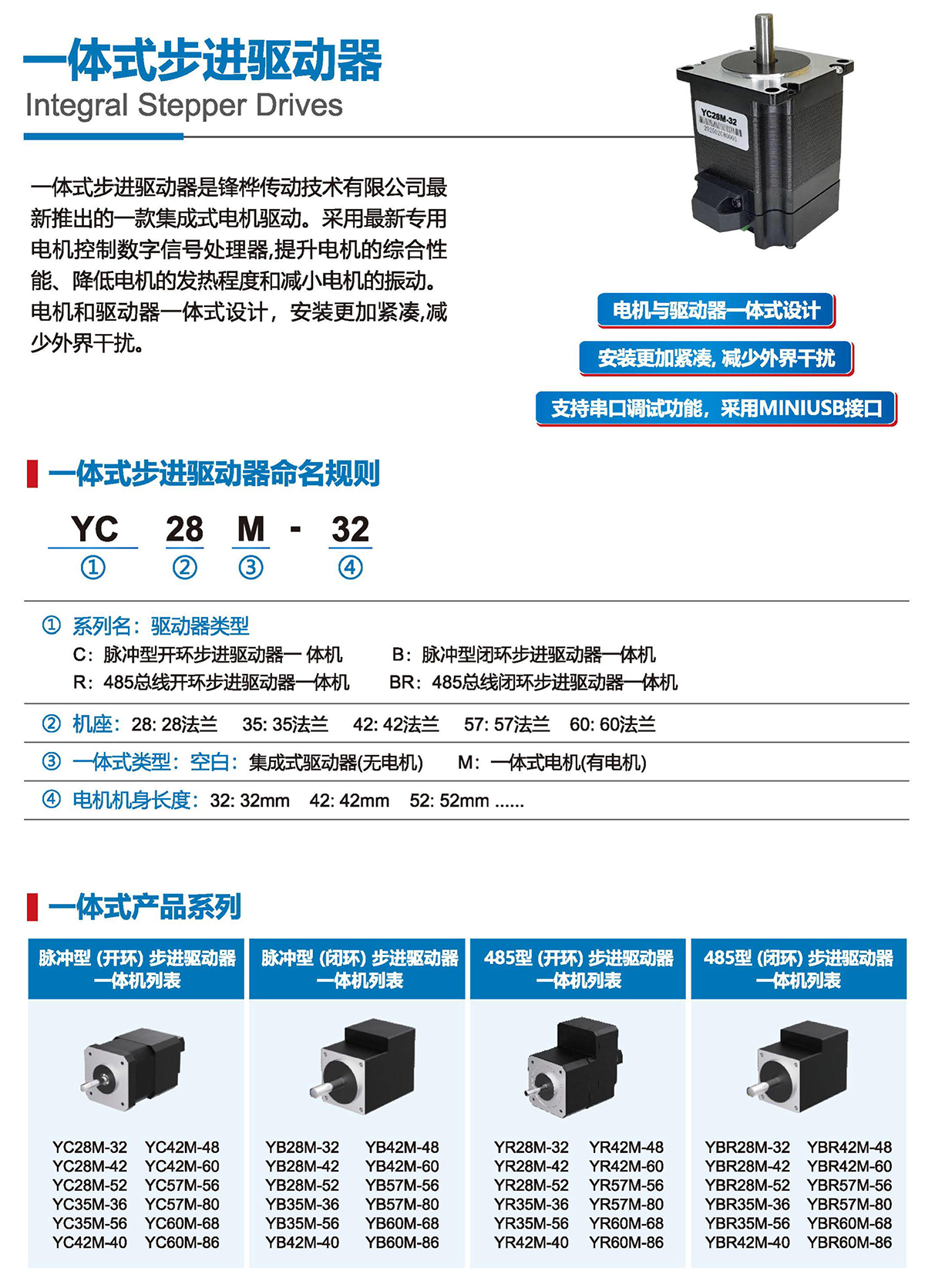 一體式步進驅動器是鋒樺傳動技術有限公司最新推出的一款集成式電機驅動。采用最新專用電機控制數字信號處理器提升電機的綜合性能、降低電機的發熱程度和減小電機的振動。電機和驅動器一-體式設計,安裝更加緊湊,減,少外界干擾。