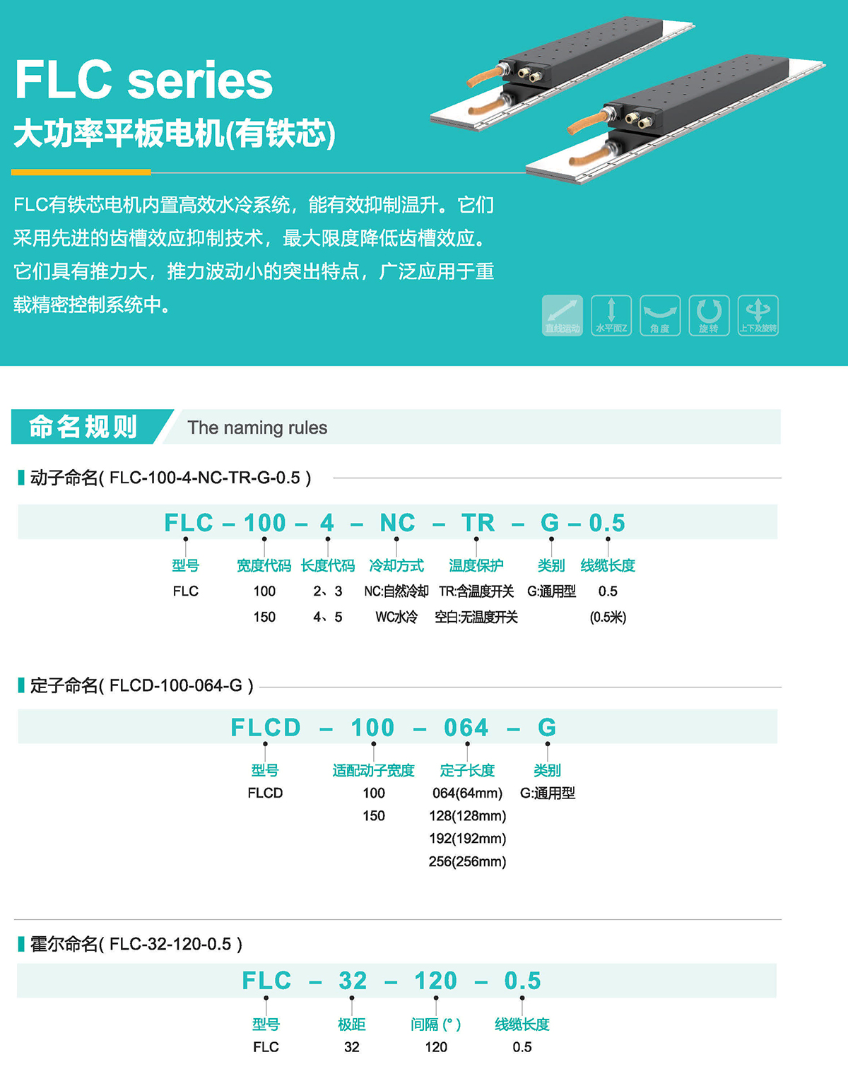 FLC有鐵芯電機內置高效水冷系統,能有效抑制溫升。它們采用先進的齒槽效應抑制技術,最大限度降低齒槽效應。